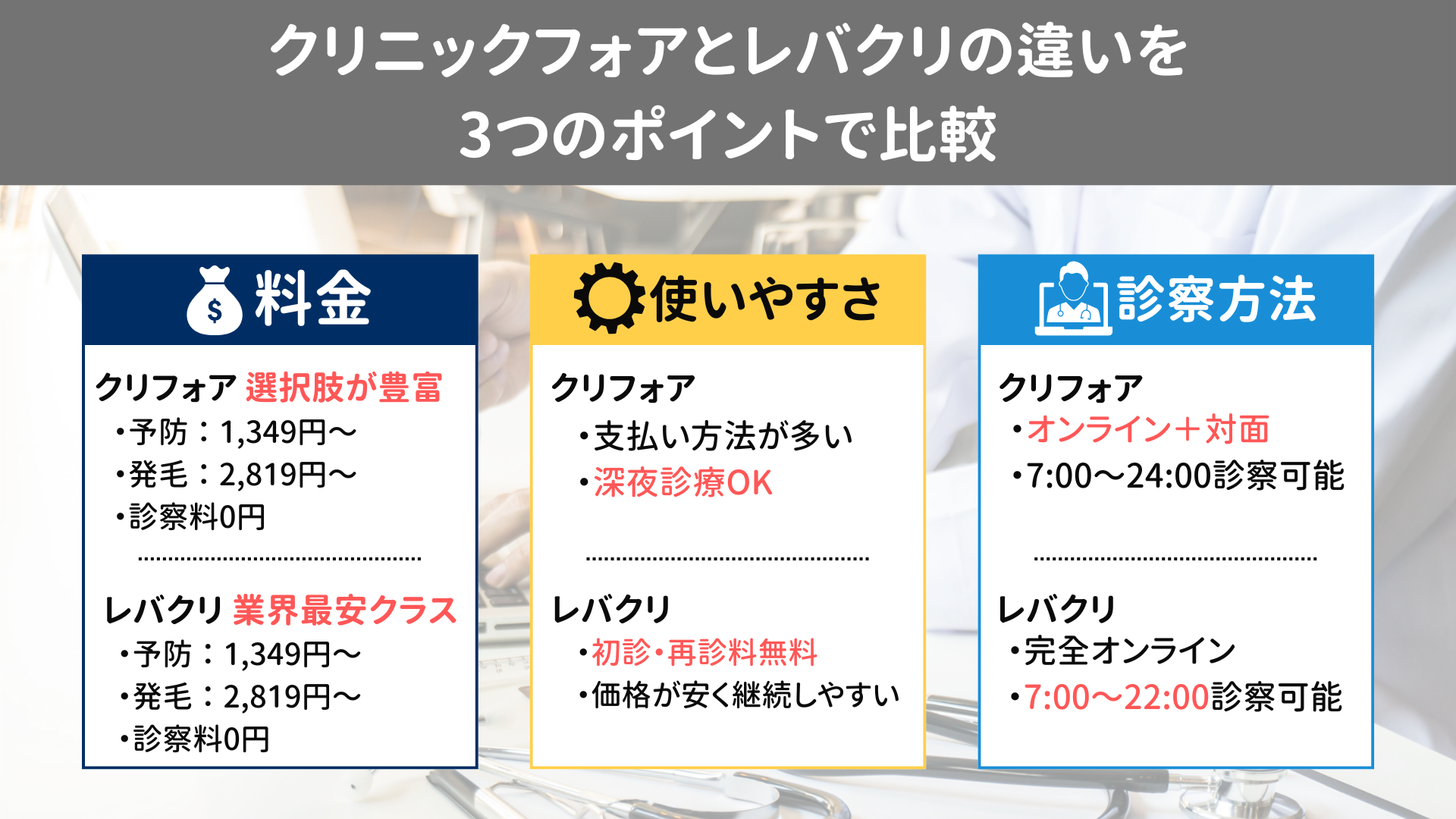 クリニックフォアとレバクリは、治療に使用するお薬や診察の仕組みは共通する部分が多いですが、料金設定や診療形態、対応時間などに違いがあります。