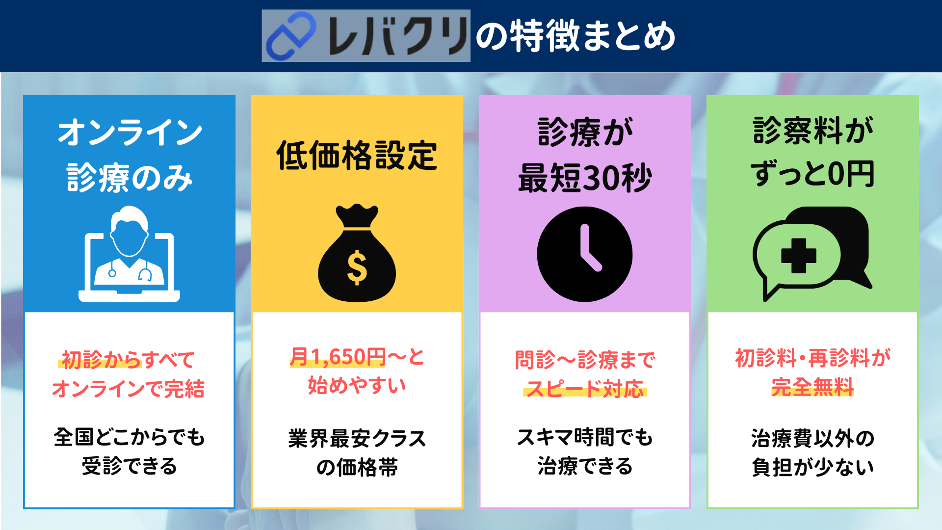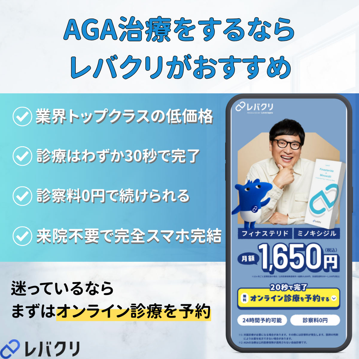 レバクリは、オンライン診療に特化したAGA治療クリニックとして、以下の特徴があります。
