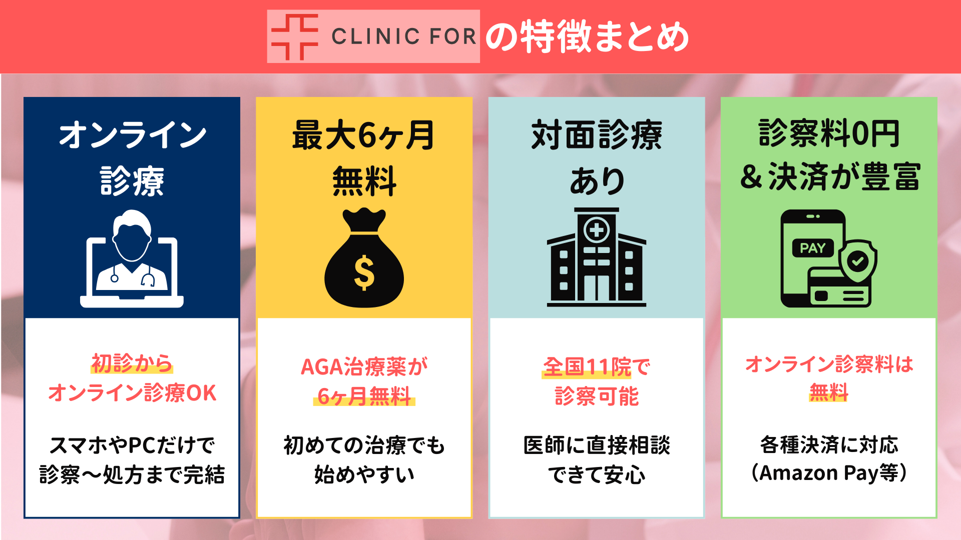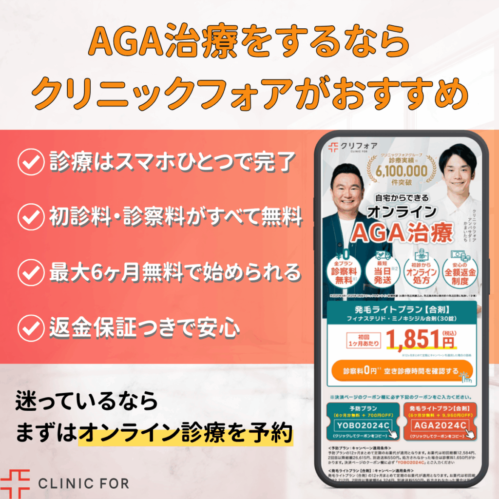 AGA治療は、対面診療も可能な安心感や幅広い支払い方法を重視するならクリニックフォアが適しています。