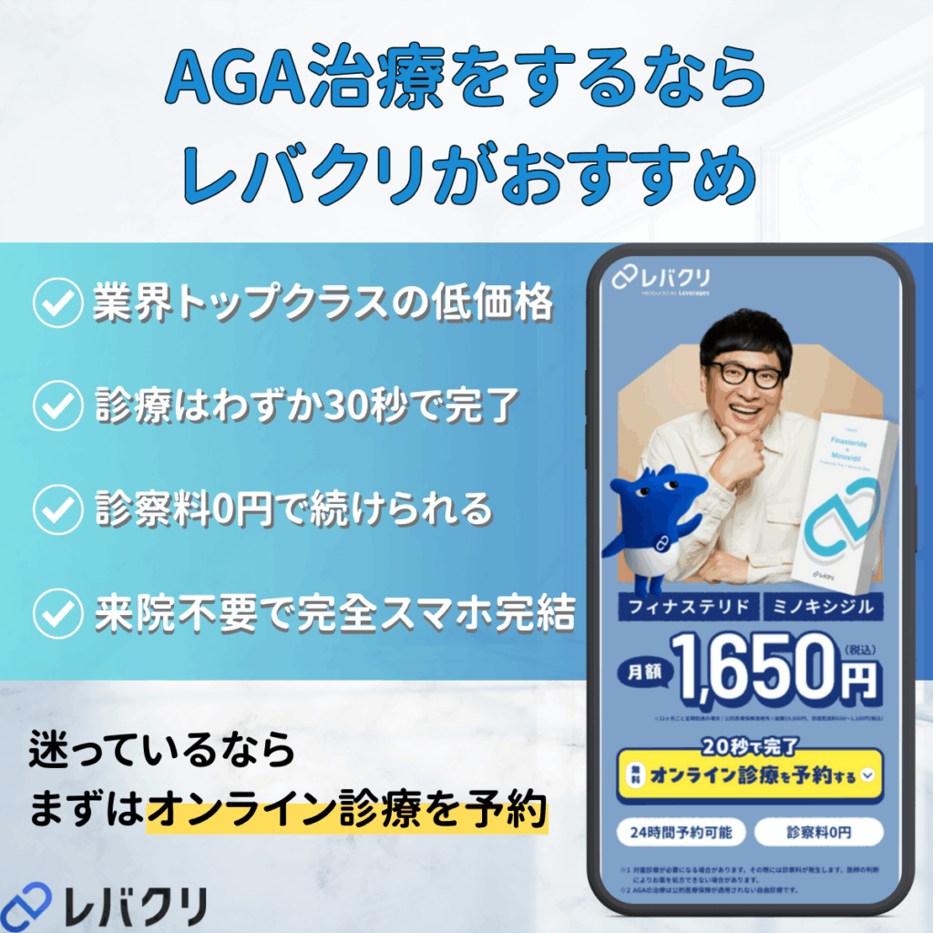 一方、レバクリは柔軟な予約変更や初回割引など、利用者が治療を試しやすい環境が整っているため、初めてAGA治療に挑戦する方や、気軽にオンラインで診察を受けたい方におすすめです。