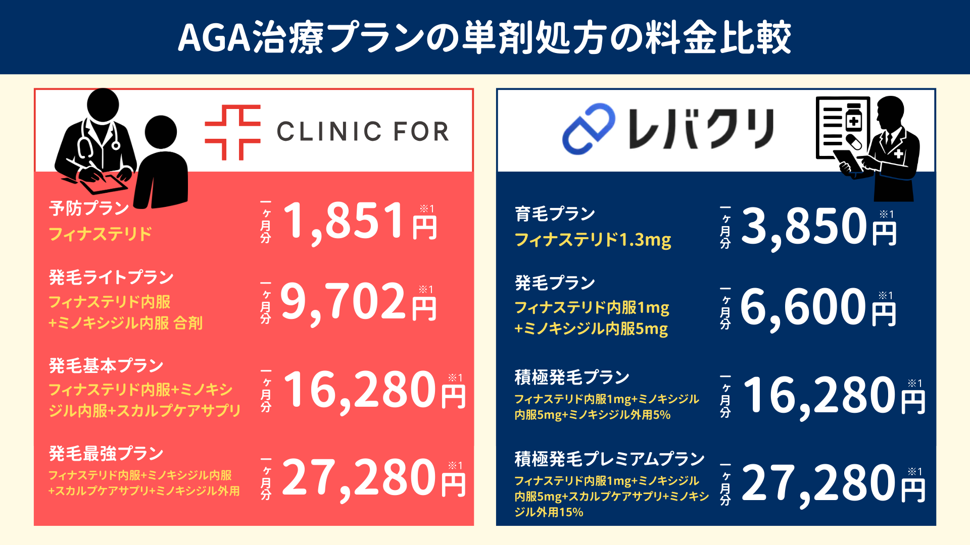 | AGA治療予防プラン | フィナステリド単剤:8,140円/月、予防プラン:4,015円/月 | フィナステリド単剤:1,349円/月、予防プラン:1,650円/月 |