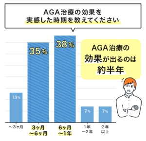 多くのAGAクリニックで、1ヶ月や3ヶ月程度で効果が実感できると記載されているケースが見受けられますが、実際、クリニックでの治療において一般的に効果を実感されるまでに必要となる時間は6ヶ月~1年と言われています。