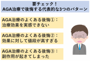 当記事ではそういった中でもAGA治療で後悔する代表的なパターンと、その防ぎ方とAGA治療で後悔しないためのおすすめクリニックの選び方をそれぞれご紹介していくので、ぜひ参考にしてください。