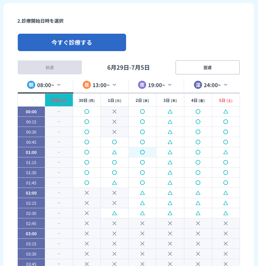 カレンダーが表示されるので、ご自身の都合の良い日時を選択するか、「今すぐ診療」を選んで即時診察に進むことも可能です。