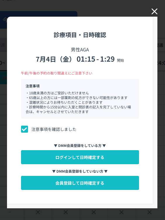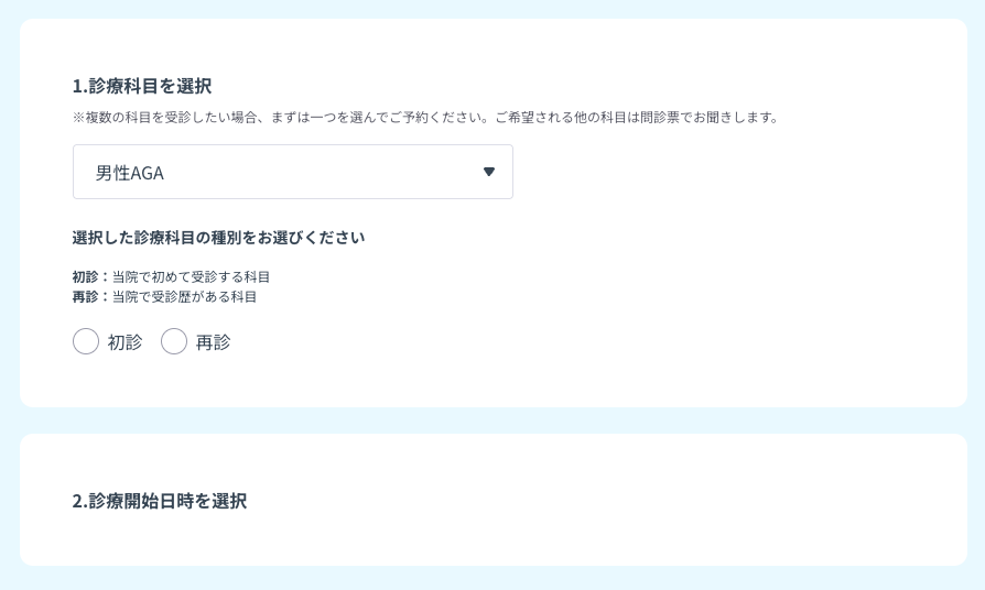 トップページにある「診療予約」ボタンをクリックし、診療科目の中から「男性AGA」を選択してください。