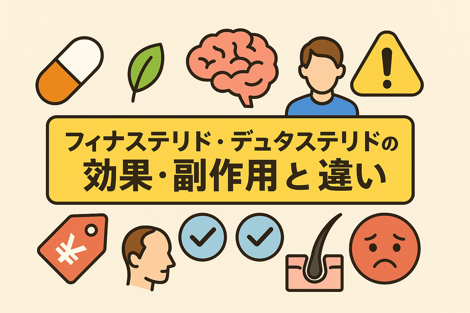 5αリダクターゼI型およびII型酵素の両方の働きを阻害します。フィナステリドよりも広範囲の酵素を阻害するため、より高いAGA抑制効果が期待できるとされていますが、その分副作用のリスクもフィナステリドよりやや高い可能性があります。
