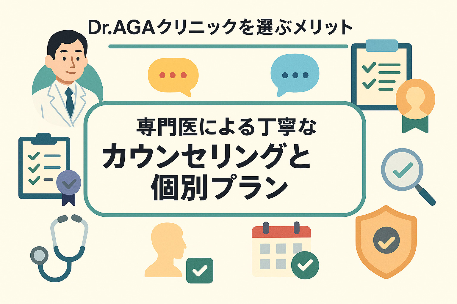 Dr.AGAクリニックの最大のメリットの一つは、AGA治療に精通した専門医とカウンセラーによる丁寧なカウンセリングが受けられる点です。初回の無料カウンセリングから、患者さん一人ひとりの薄毛の悩み、頭皮の状態、生活習慣、遺伝的要因などを詳細にヒアリングします。