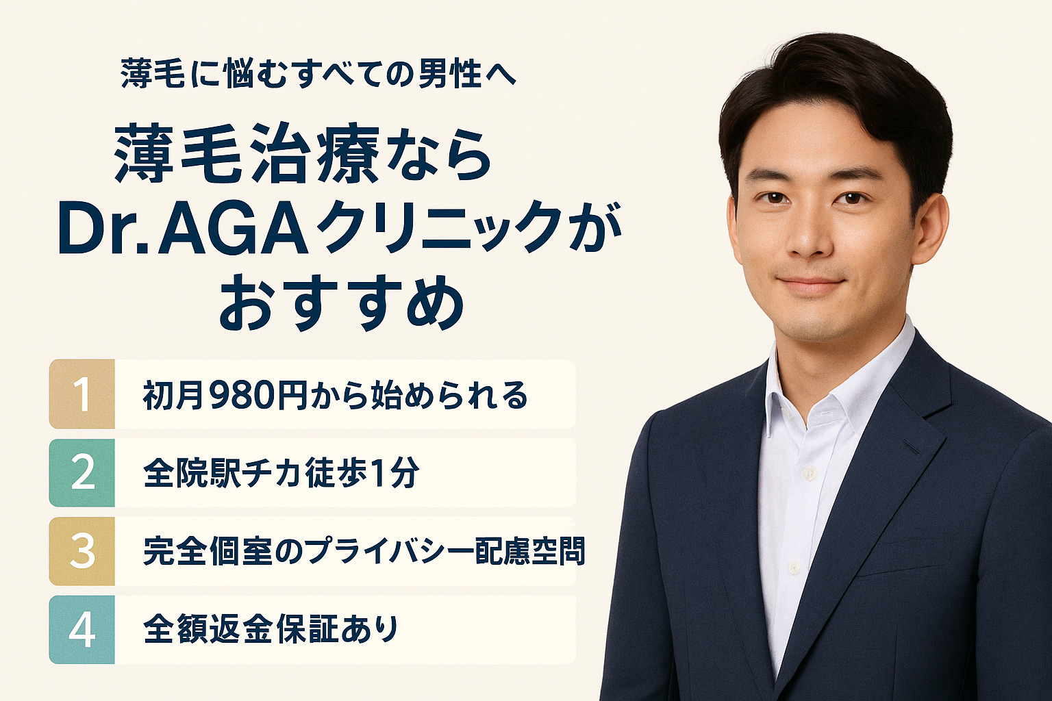 この記事は、Dr.AGAクリニックに関する一般的な情報提供を目的としており、特定の治療法や製品の効果を保証するものではありません。AGA治療の効果や副作用には個人差があり、全ての情報が全ての方に当てはまるわけではありません。治療を開始する際は、必ず専門の医師の診察を受け、自身の健康状態や既往歴、服用中の薬などを正確に伝え、医師の指示に従ってください。自己判断による治療の中止や変更は、予期せぬ健康被害につながる可能性があります。本記事の情報に基づいて生じたいかなる損害についても、当方では一切の責任を負いかねます。最新の情報や正確な料金については、必ずDr.AGAクリニックの公式サイトまたは直接お問い合わせの上ご確認ください。