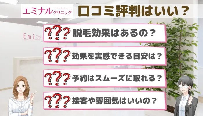 上記のような悩み・不安を解決できるように、本記事ではエミナルクリニックの医療脱毛や口コミでの評判を徹底調査しました。