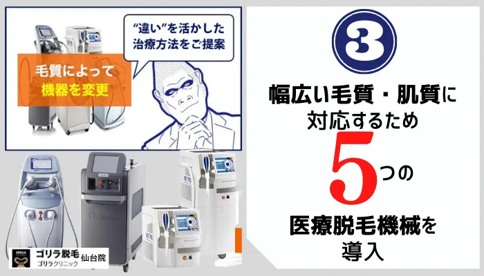 3. 幅広い毛質・肌質に対応するため5つの医療脱毛機械を導入