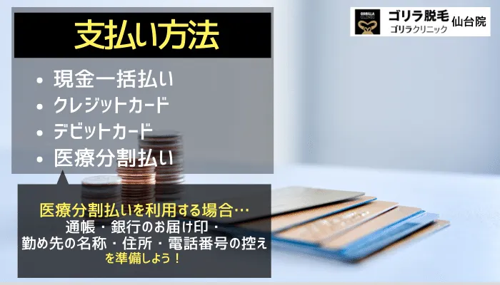 ゴリラクリニック仙台院では、以下4つの支払い方法に対応している。