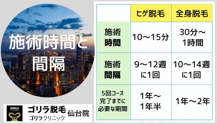 ゴリラクリニックでは、毛の生え変わるサイクル(毛周期)に合わせ施術を行っているため、ヒゲは9~12週間隔、ボディ部分は10~14週間隔で施術を受けることができる。