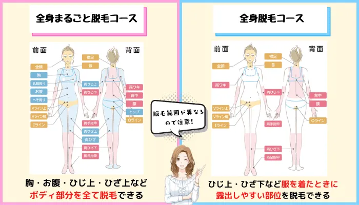 「全身まるごと脱毛コース」は、「顔」「VIO」「襟足・首(うなじ)」以外の全ての部位を脱毛でき、通常の「全身脱毛コース」は、服を着た状態で肌が露出しやすい部位に絞って脱毛できます。
