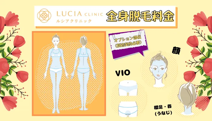 ルシアクリニックの全身脱毛は、「顔」「VIO」「襟足・首(うなじ)」がオプション扱いとなっています。