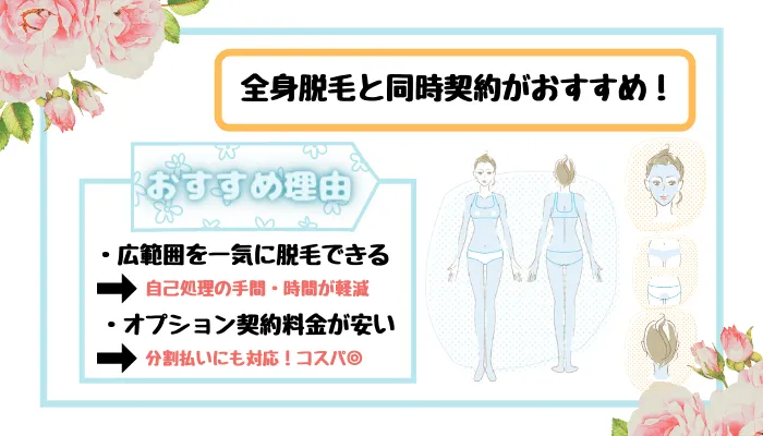 例えば、全身脱毛+オプション1部位を各5回ずつ同時契約する場合、全身脱毛自体の総額が[affi id=195]まで安くなります。