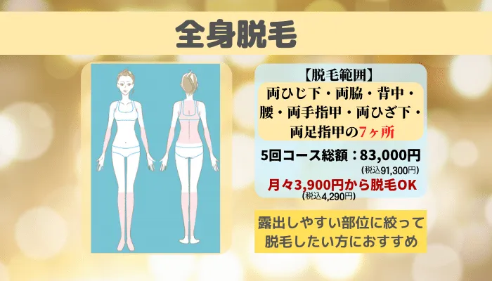顔とVIOを除くスタンダードな全身脱毛の料金は[affi id=195]とコスパも最強です。