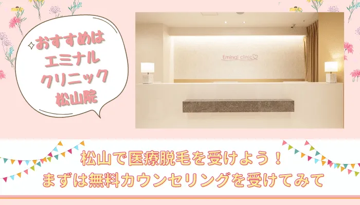 ここまで読んでもクリニック選びに迷っているのなら、脱毛料金が安い・複数のレーザー使用でさまざまな肌質・毛質に対応できる『エミナルクリニック松山院』をおすすめします。