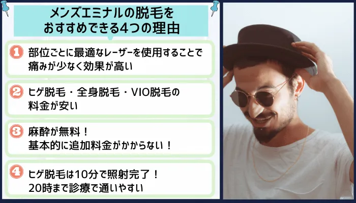 エミナルクリニックメンズの医療脱毛を受けたいと考えている方に向け、ヒゲ脱毛や全身脱毛、VIO脱毛の詳しい料金と口コミ評判、使用しているレーザー脱毛の機械などを調査した結果を紹介する。