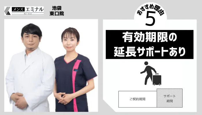 まだ契約した回数を通い終えていない段階で、長期出張や留学、入院などで通えなくなってしまった場合、エミナルクリニックメンズでは有効期限を延長できる「サポート期間」を設けている。