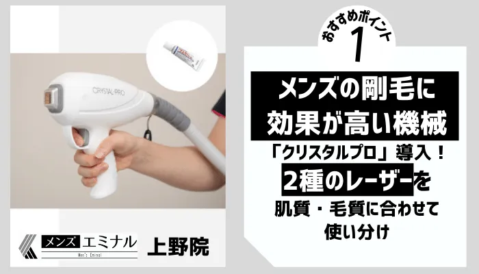 エミナルクリニックメンズ上野院は、「上野駅」より徒歩1分とアクセスは抜群、月々[affi id=9315]でヒゲ脱毛が受けられる、麻酔代が無料など魅力の多いクリニックだ。上野で医療脱毛を受けたいと考えている方にぜひおすすめしたい。