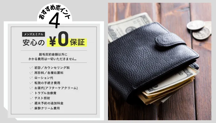エミナルクリニックメンズ上野院は、脱毛料金以外に必要な費用が一切ないのも特徴の1つである。他院で有料オプションとなりやすい麻酔代も0円で利用可能だ。