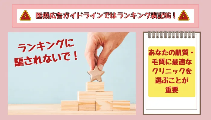 料金の安さなどでランキング付けをしているメディアも多いですが、料金の安さ=脱毛効果の高さというわけではなく、1位のクリニック・皮膚科がすべての人におすすめという根拠がないため、ランキング掲載を行っているメディアを信用してはいけません。