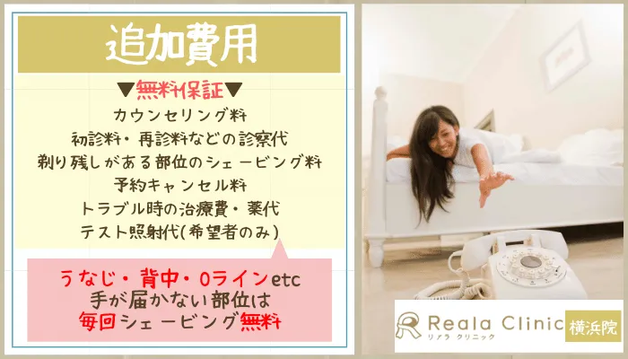 リアラクリニック横浜院では、基本的に脱毛料金以外の費用はかかりません