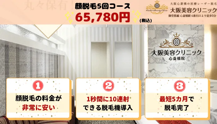 お支払いしやすいリーズナブルな価格で顔脱毛を受けたい方におすすめなのは『大阪美容クリニック』です。