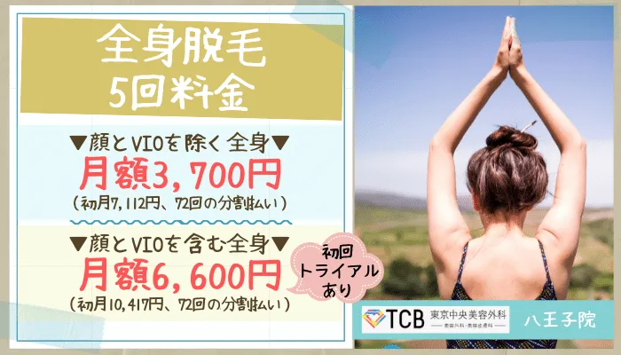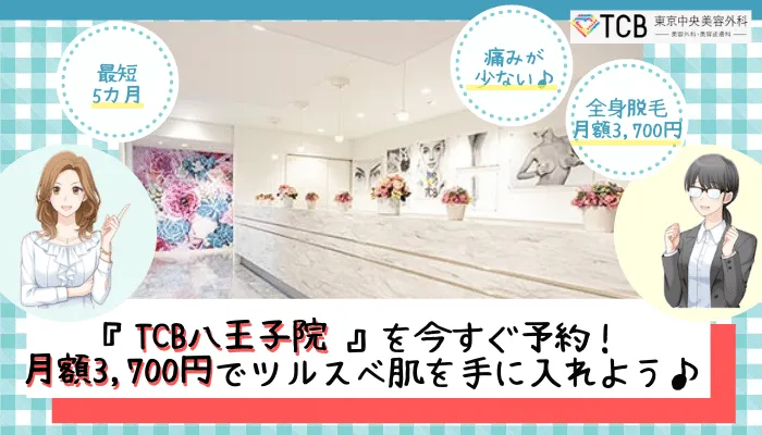 TCB八王子院は、全身脱毛が月額[affi id=1481]と少ない負担で医療脱毛が受けられるのが魅力のクリニックです。