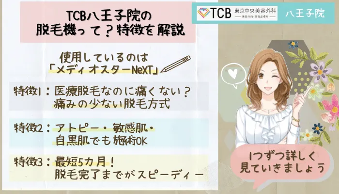 続いて、TCB八王子院で使用している脱毛機の種類と特徴についてご紹介します。