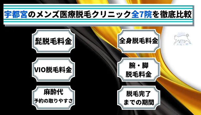 早速、宇都宮でメンズ脱毛を行っている医療脱毛クリニック全7院の料金や特徴を比較表でチェックしましょう。