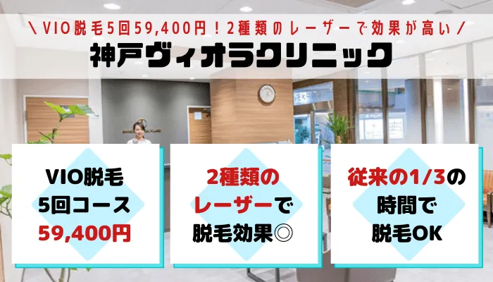 全身脱毛・VIO脱毛・顔脱毛・脇脱毛の部位別に神戸でおすすめの医療脱毛クリニックを知りたい方は『神戸の医療脱毛で料金が安いおすすめクリニック比較』の記事をチェックしてみてくださいね。