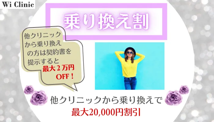 「乗り換え割」は、他店で脱毛を受けていてウィクリニックに乗り換え予定の方が利用できる割引です。