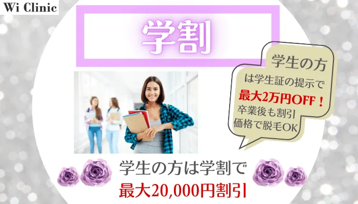 現在学生の方は、「学割」を利用すると最大20,000円OFFの割引価格で脱毛できます。