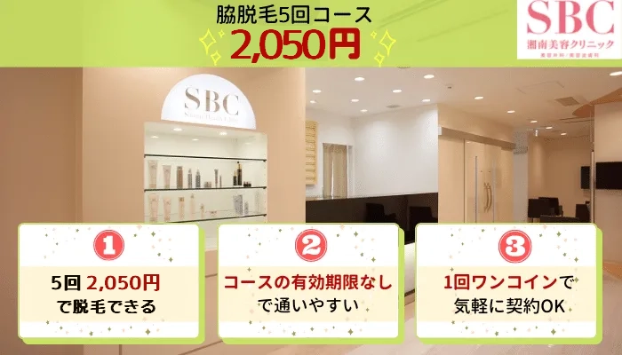 湘南美容クリニックの脇脱毛は、5回2,050円と相場に比べて非常に安いのが特徴です。